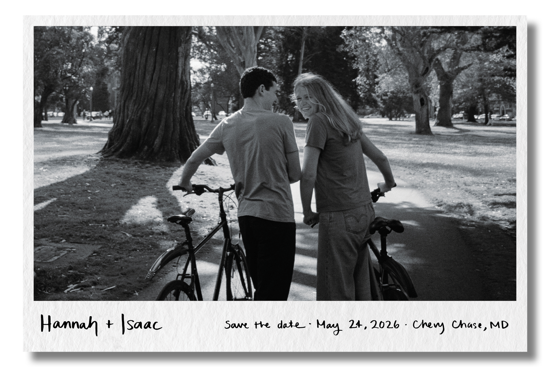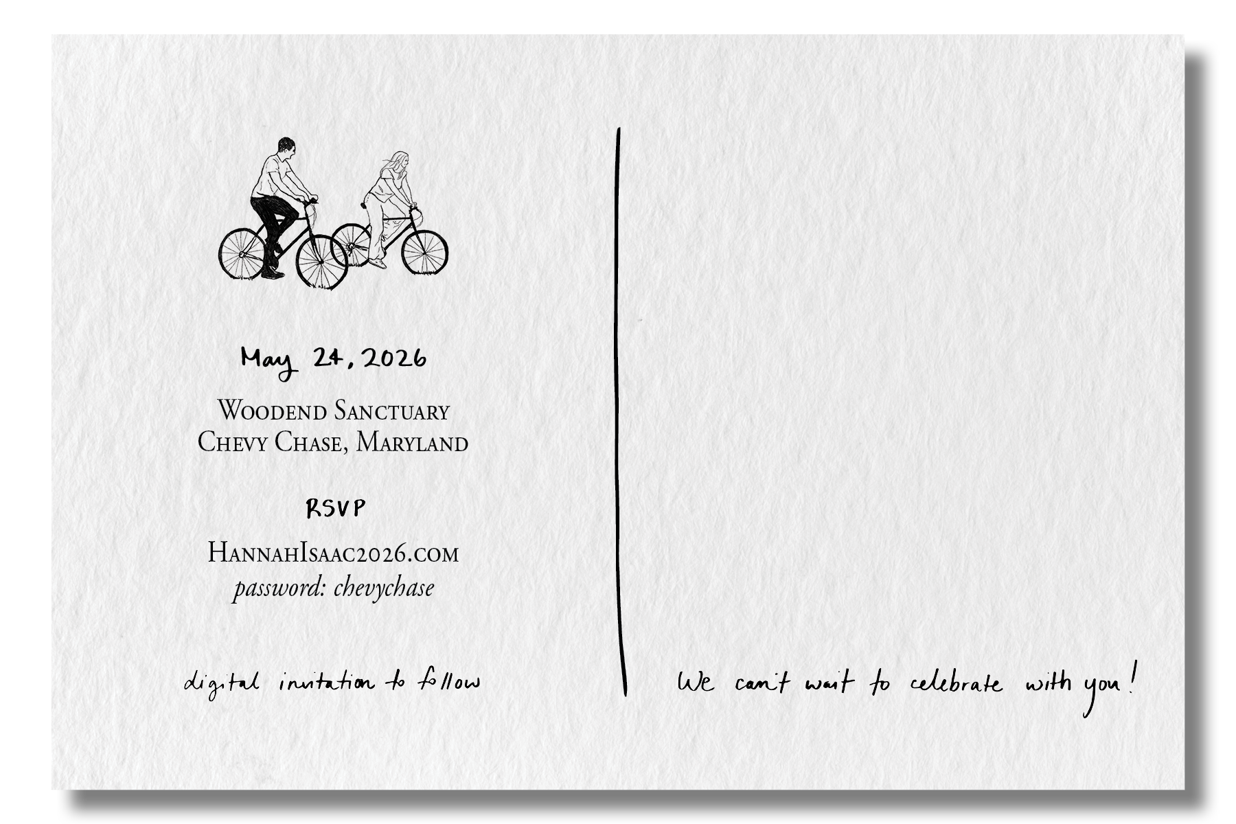Hannah and Isaac wanted an un-fussy save the date and identity that was a nod to their passion for cycling and their life in San Francisco. I directed the photoshoot for them on their bikes in the park, and used the photos as inspiration for a hand-drawn illustration of them on their bikes which became the wedding logo (which I also turned into an animated gif for their website). I created custom handwritten typography for the save the date and designed the postcard layout.